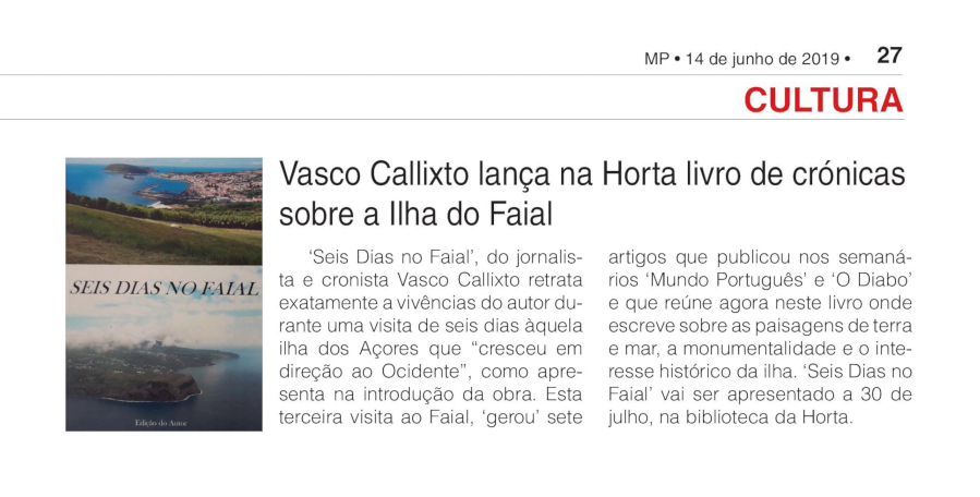 A Biblioteca Pública e Arquivo Regional João José da Graça promove o lançamento do livro “Seis Dias no Faial” do jornalista Vasco Callixto, que irá decorrer no Auditório desta instituição no dia 30 de julho às 18:30h.