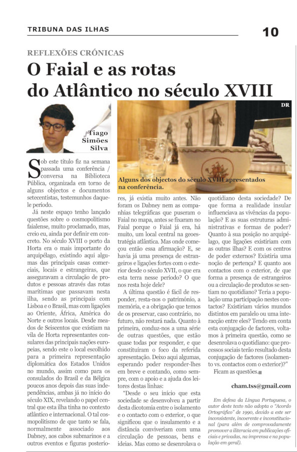 (Silva, T., 2019. O Faial e as Rotas do Atlântico no século XVIII. Tribunas das Ilhas, Ano XVII . Nº 873, pág. 10)