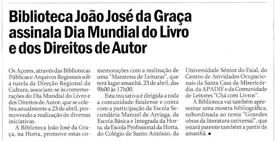 Comemoração do Dia Mundial do Livro e dos Direitos de Autor e do 11º Aniversário da Biblioteca Pública e Arquivo Regional João José da Graça com a realização de uma maratona de leituras, de histórias ou excertos, que contou com a participação de mais de centena e meia de pequenos e graúdos.