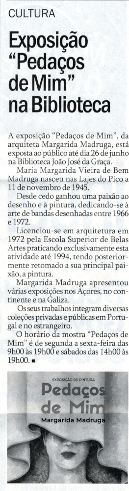 Notícia publicada no jornal Incentivo, no passado dia 9 de abril, sobre a Exposição “Pedaços de Mim” de Margarida Madruga patente ao público na Sala de Exposições até ao dia 26 de junho.
